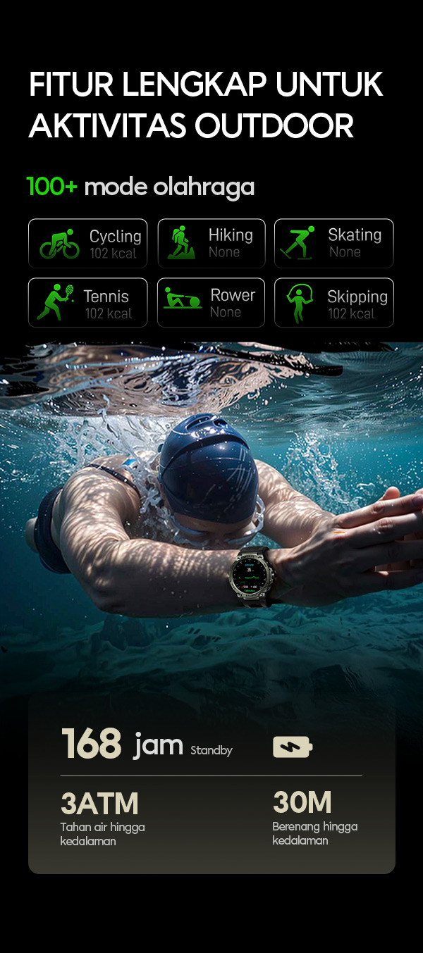 - Tahan air hingga 5ATM, aman digunakan untuk berenang, olahraga outdoor, dan aktivitas harian tanpa khawatir air.