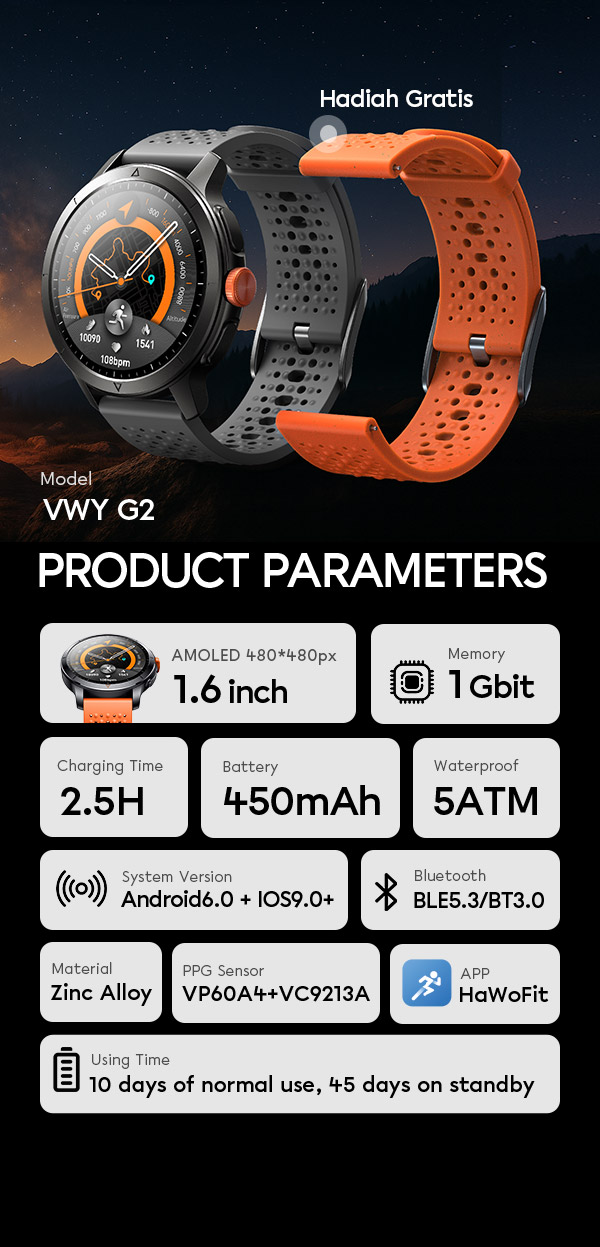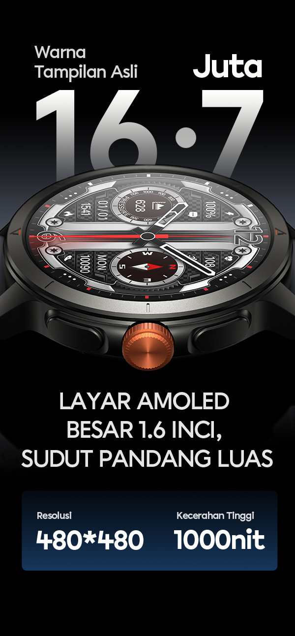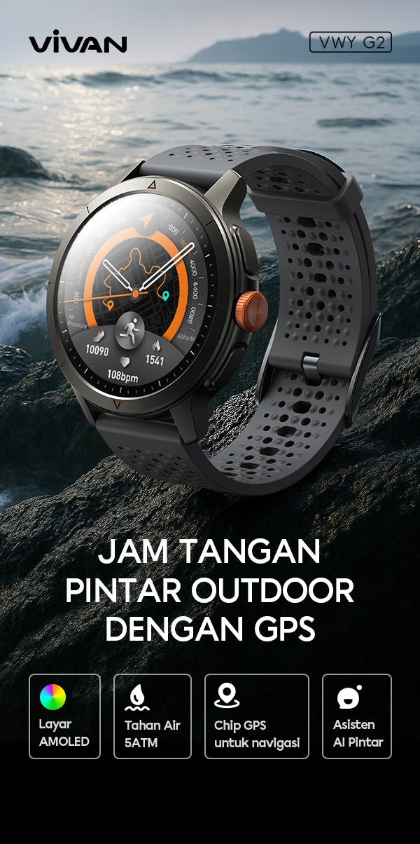 - VIVAN Smart Watch VWY G2 dengan layar AMOLED 1.6 inci yang tajam, warna lebih hidup, dan visibilitas optimal di berbagai kondisi cahaya.