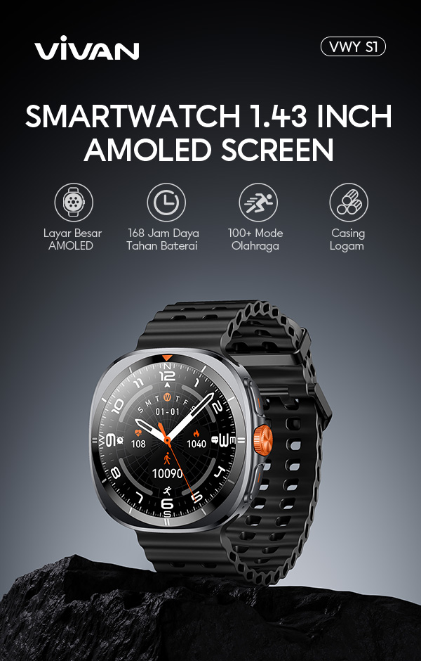 - VIVAN Smart Watch VWY S1 dengan layar AMOLED 1.43 inci yang tajam, warna lebih hidup, dan kontras tinggi untuk tampilan premium.