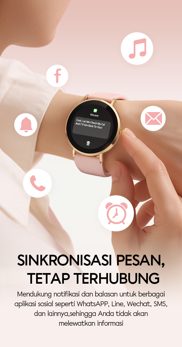 - Notifikasi pintar untuk panggilan, pesan, dan aplikasi media sosial langsung di pergelangan tangan.