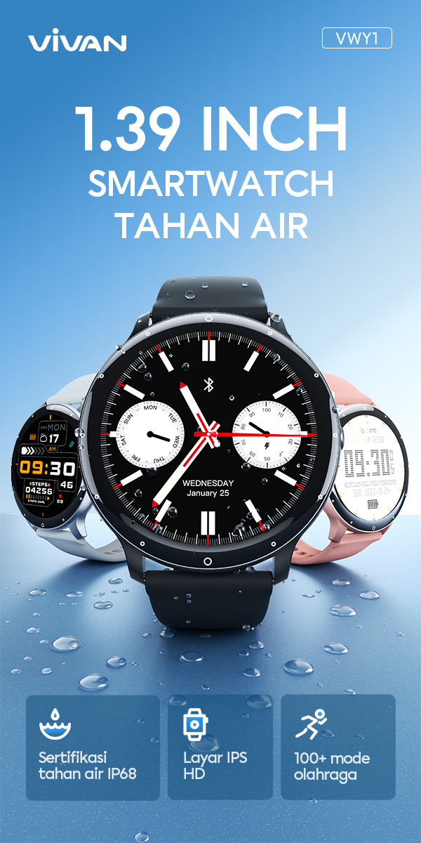 - Smart Watch VIVAN VWY1 dengan layar IPS 1.39 inci yang jernih dan responsif, nyaman untuk melihat notifikasi dan menu.