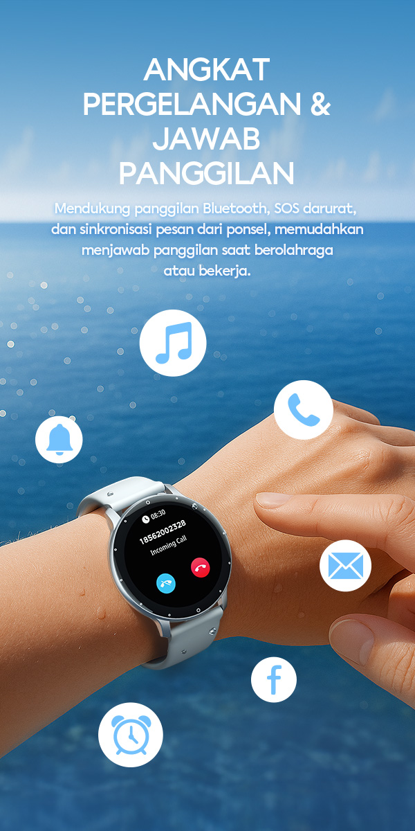 - Fitur notifikasi pintar untuk panggilan, pesan, dan aplikasi sosial langsung di pergelangan tangan.