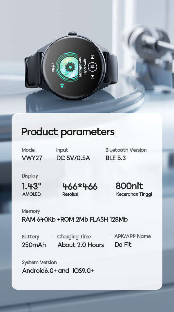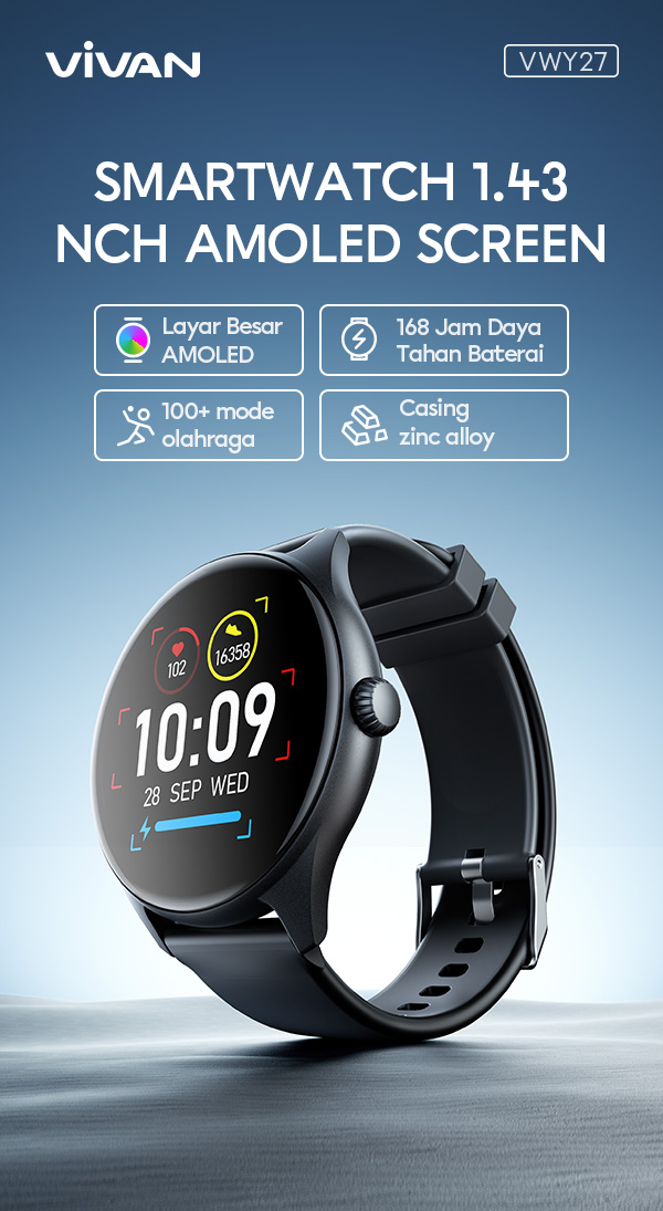 - Smart Watch VIVAN VWY27 dengan layar AMOLED 1.43 inci berbentuk round, menghadirkan tampilan tajam, warna lebih hidup, dan kontras tinggi.