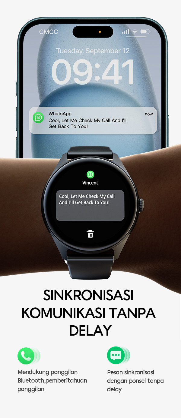 - Fitur notifikasi pintar untuk panggilan, pesan, dan aplikasi sosial langsung di pergelangan tangan.